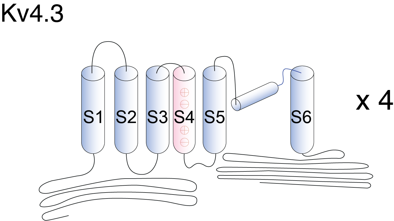 Kv4.3, encoded by the gene KCND3, is a member of the potassium voltage-gated channel subfamily D. Kv4.3 regulate repolarization of cardiac action potentials, firing frequency in neurons and dendritic excitability. [298]