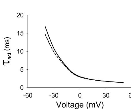 A classical Hodgkin–Huxley model of activation should show a smooth bell-shaped voltage-dependent transition between τact and τdeact. As shown in the figure there is a steep transition between the τact and the τdeact over a narrow voltage range between −60 and −40 mV at 2 mm[K+]o, which was more marked at high [K+]o [449]