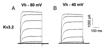 The rate of rise of Kv3.1−Kv3.3 currents is relatively fast; faster than many other voltage-gated K+ channels (e.g., Kv2.x; Kv1.2) but slower than that of other voltage-gated K+channels such as several Kv1 channels like Kv1.1, Kv1.4 and Kv1.5. Kv3.4 currents rise faster than Kv3.1−Kv3.3 currents. In contrast to other delayed rectifiers, Kv3.1 and Kv3.2 currents are not significantly inactivated by depolarizing prepulses and do not show cumulative inactivation. Records of Kv3.1 and Kv3.2 currents in mammalian cells (but not in oocytes)often show an initial fast transient component. This is usually very small (<5% of the current)and is seen mainly in response to large depolarizing pulses (to >+30 mV). The origin of this component is not clear yet. In our experience its presence and magnitude are very variable; it is more readily seen in HEK293T than in CHO cells; and it is bigger in cells expressing large currents. Critz et al.27 have suggested that it might be associated with K+ accumulation in the extracellular space.[290]