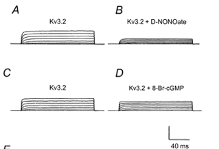 Kv3.1 and Kv3.2 currents are potentially suppressed by D-NONOate and other NO donors. The effects of NO on these currents are mediated by the activation of guanylyl cyclase (GC), since they are prevented by Methylene Blue, an inhibitor of GC, and by ODQ, a specific inhibitor of the soluble form of GC. Moreover, application of 8-Br-cGMP, a permeant analogue of cGMP, also blocked Kv3.1 and Kv3.2 currents. 4.KT5283, a cGMP-dependent protein kinase (PKG) blocker, prevented the inhibition of Kv3.1 and Kv3.2 currents by D-NONOate and 8-Br-cGMP [1550]