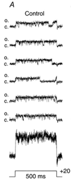 Single channel recordings of Kv3.2-transfected CHO cells were performed in the inside-out configuration of the patch clamp technique. Channels were recorded during large depolarizations, when the probability of channel opening is high [1550]