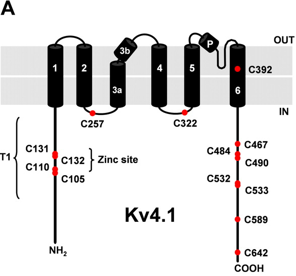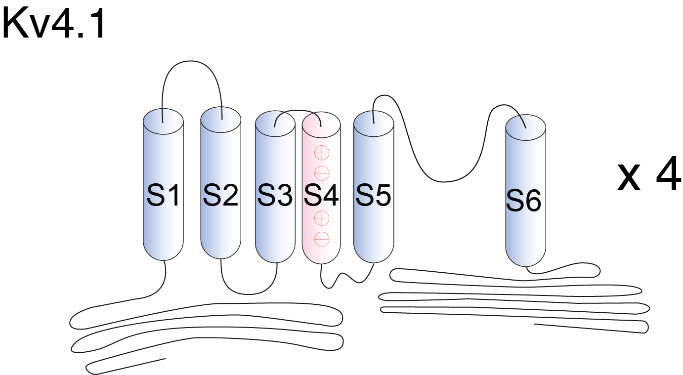 Kv4.1, encoded by the gene KCND1, is a member of the potassium voltage-gated channel subfamily D. Kv4.1 plays a role in the repolarization phase of the action potential. Kv4.1 is expressed at moderate levels in all tissues analyzed, with lower levels in skeletal muscle.NCBI