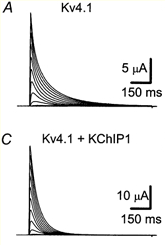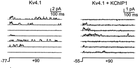 Although Kv4.1 and Kv4.2 share high sequence similarity, KChIP1 has opposite effects on their voltage dependence of activation and the inactivation time courses. KChIP1 slows Kv4.2 inactivation but accelerates the Kv4.1 inactivation time course [1563]