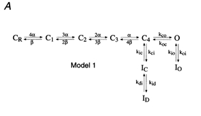 The two main kinetic features of Model 1 are, first, that Kv4.1 channels have to return from the short-lived open-inactivated state IO via the open state to the pre-open closed state before they can enter the closed-inactivated state, IC, and second, that cumulative Kv4.1 channel inactivation is a two-step reaction involving the closed-inactivated state, IC, and the deep-inactivated state, ID [30]