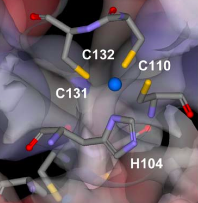 A stick representation of the coordinating residues is shown. C131, C132 and H104 are from the same subunit, and C110 is from the neighboring subunit. The blue sphere represents a Zn2+ ion in the binding site. Although the isolated T1 domain oligomer is typically Zn2+-bound, the T1 domain in the intact Kv4.1 channel appears to be Zn2+-free or partially liganded [1562]