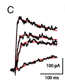 simulated Kv1.2 current (red line) captures inactivation properties of the Kv1.2 channel population as represented by 3 α-DTX-sensitive currents evoked by the same membrane potential step [294]