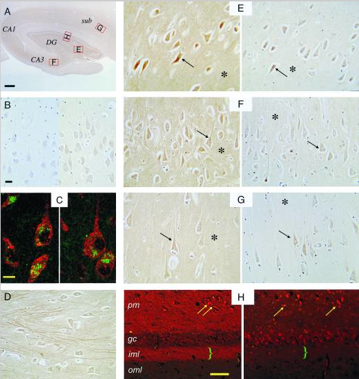 In the hippocampal formation and cerebral cortex, KCNQ2 and KCNQ3 staining was detected on the somata and dendrites of many polymorphic and pyramidal neurons. Confocal immunofluorescence microscopy revealed that this somatodendritic staining was punctate in character and appeared to label both the cell surface and intracellular components (C). In the hippocampal formation, hilar polymorphic cells. ( E and H), CA3 pyramidal cells (F), and subicular pyramidal cells (G) exhibited somatodendritic staining for both subunits.