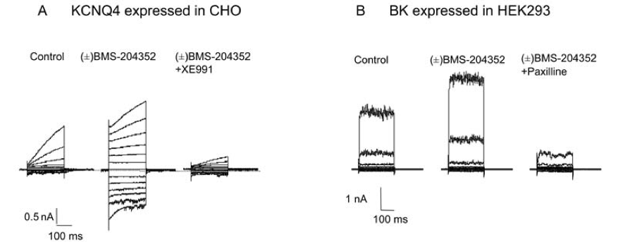 Here we show that (+/-)BMS-204352 also induces a voltage-independent KCNQ4 current. The channels were stably expressed in human embryonic kidney cells (HEK293), and investigated by use of the whole-cell mode of the patch-clamp technique. The voltage-independent current reversed at the equilibrium potential for potassium (EK), hence was carried by a K+ conductance, and was blocked by the selective KCNQ channel blockers XE991 and linopirdine. Similar results were obtained with KCNQ4 channels transiently transfected into Chinese hamster ovary cells (CHO) [1819]