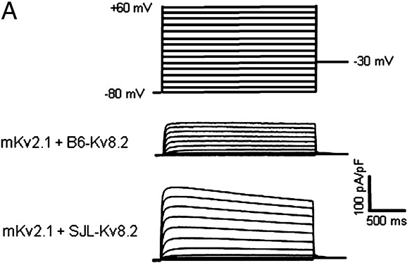 Coexpression of mKv2.1 with B6-Kv8.2 produced significantly greater suppression than SJL-Kv8.2 for voltage steps between 0 mV and +60 mV. Further, B6-Kv8.2, but not SJL-Kv8.2, had a significant effect on the kinetics of activation that was limited to a single test potential (0 mV) without a corresponding change in voltage dependence. Neither Kv8.2 isoform differed in the magnitude of cumulative inactivation evoked by moderate-frequency pulse trains, but SJL-Kv8.2 did evoke a greater time-dependent decay in whole-cell current [730]