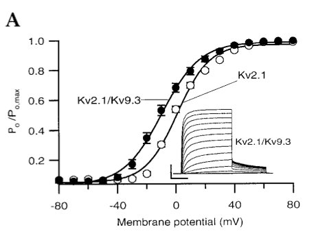 Kv9.3 increased the single-channel conductance of Kv2.1, from 8.5 to 14.5 pS. At the pharmacological level, the sensitivity to both 4-AP and TEA were reduced when Kv2.1 was co-expressed with Kv9.3. The alterations in the biophysical and pharmacological properties of Kv2.1 by Kv9.3 suggest that these two subunits associate to form a heteromultimer whose properties are different from that of the Kv2.1 [1871]