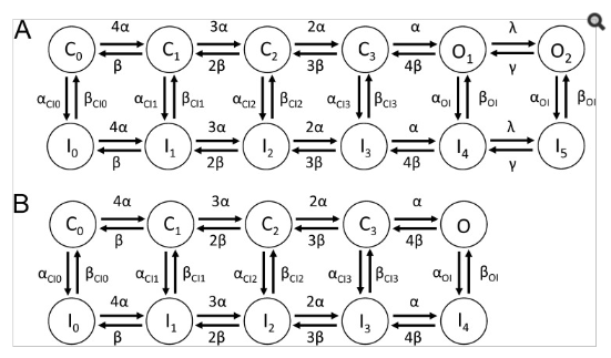 Markov modelling demonstrated that simple 5- and 6-state models were inadequate and that a 10- or 12-state model was more appropriate for description of EAG1 channels [1504]