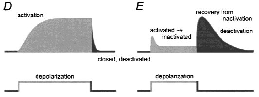 (D) Schematic drawing of an eag-mediated current. Upon a depolarization a slowly activating noninactivating outward cur- rent is elicited. Upon repolarization a small tail current occurs. (E) Schematic drawing of an erg-mediated K+ current elicited by a depolarization. At a negative holding potential, erg K channels are closed and deactivated. A strong depolarization elicits a small current transient followed by a small steady-state outward current because inactivation is faster than activation. Upon repolarization a large transient outward current occurs [778]