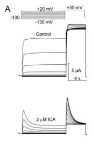 ICA strongly inhibits inactivation and thereby increases the magnitude of hERG1 channel currents (same family as EAG1), especially at positive potentials [1510]. The effects of this compound (ICA) on hEAG1, were tested with the expectation that it might also inhibit intrinsic inactivation and increase current magnitude. Instead, we found that ICA appeared to enhance inactivation of hEAG1. [1504]