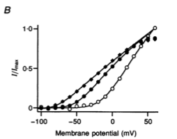 The continuous curves are the result of data fits according to a Hodgkin Huxley formalism ;data and fits were normalized to the fit result at +60 mV. [1723]