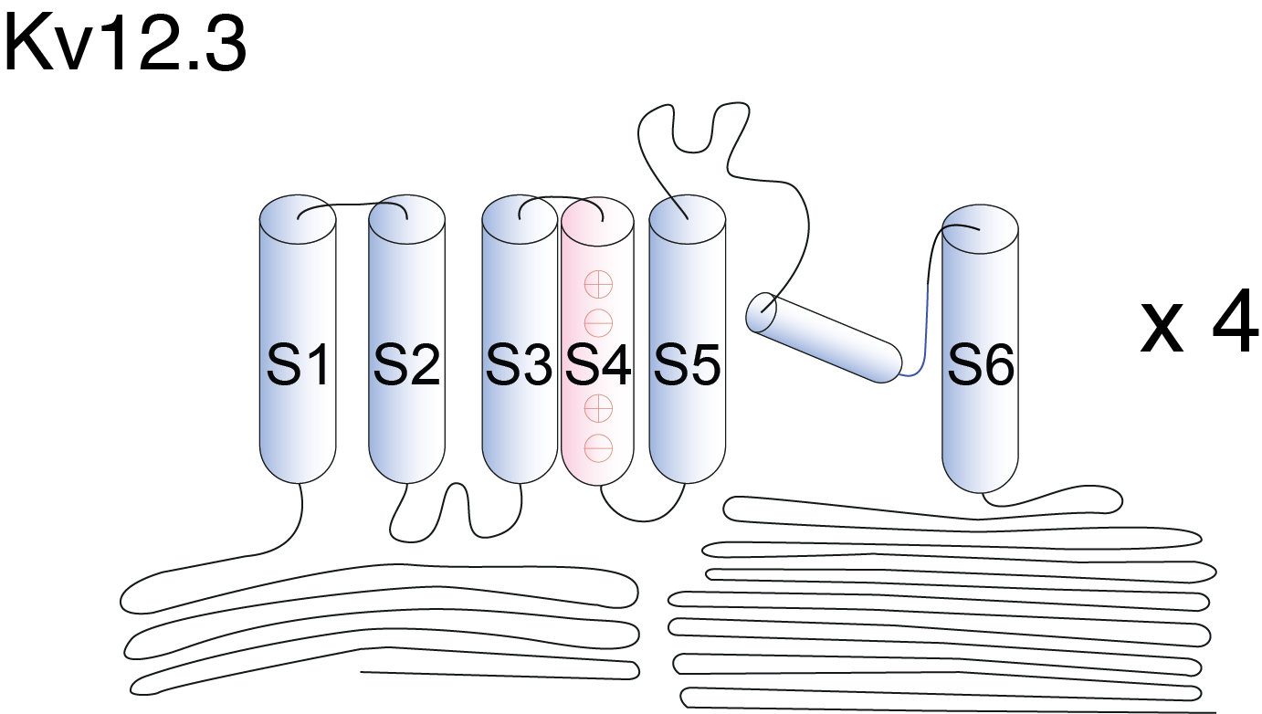 Kv12.3 is a slowly activating voltage-gated potassium channel with threshold for activation at 90 mV [809].