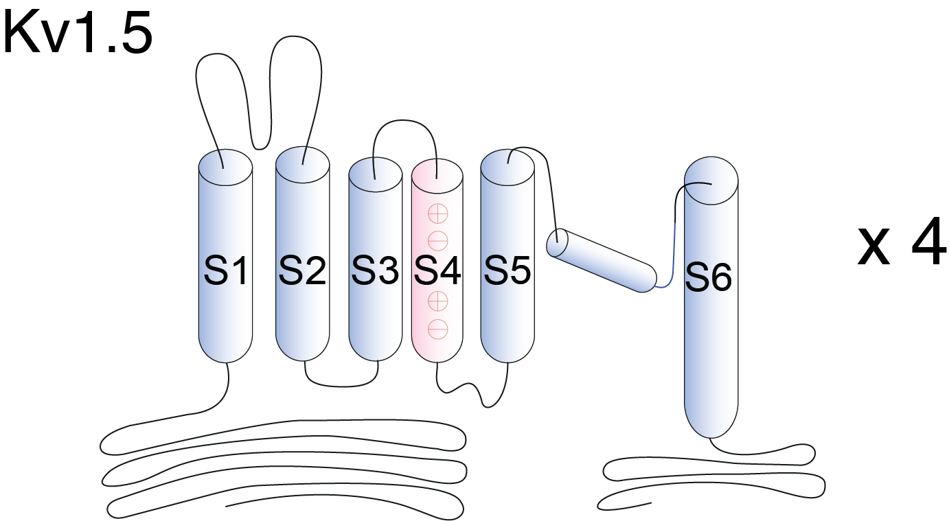 Kv1.5, encoded by the gene KCNA5, is a member of the potassium voltage-gated channel subfamily A. Kv1.5 is expressed in many other organs, such as pulmonary arteries, brain, skeletal muscle, and have crucial function in cell cycle regulation. Kv1.5 underlies the cardiac ultra-rapid delayed rectifier potassium current (IKur) in humans. IKur has important roles in controlling action potential (AP) shape and contractility in the human atrium [1573]
