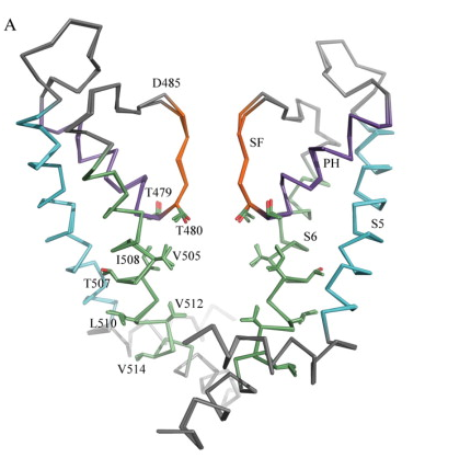 The homology model of Kv1.5 is structurally more or less identical to the template, i.e., the pore region of the crystal structure of Kv1.2 (PDB accession code 2A79), which is not surprising, given the very high sequence identity in this region [1576]