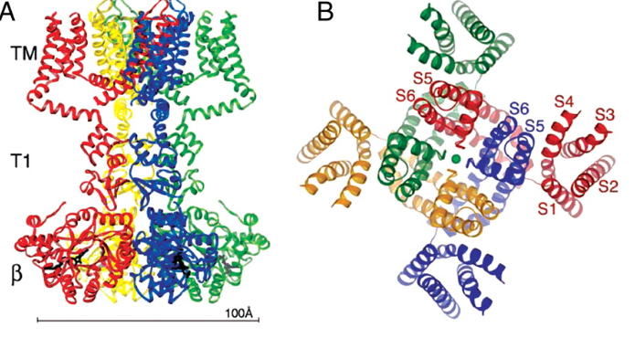 The beta-subunits of the Kv channels (Kvb1–4) are cytosolic proteins that bind to the cytoplasmic T1 domain of the membrane spanning Kv1 and Kv4 proteins [589].