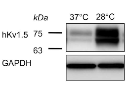 Reduced-temperature (even at 34C) culture substantially enhanced the hKv1.5 currents, which is associated with stabilization of the channel protein, slower degradation of its immature protein and the accumulation of mature protein on the plasma membrane [1573]