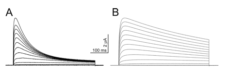 Whole-cell current traces were recorded in tsA-201 cells expressing hKv1.7 channels. The currents were evoked by depolarization to 0 mV or to 40mV from a holding voltage of -80mV. Currents facilitated by the human homologue of Kv1.7. resembled those of the mouse short isoform of Kv1.7. [1650]